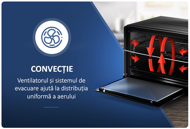 Cuptorul Albatros vine dotat cu un ventilator si un sistem de evacuare care ajuta la distributia uniforma a aerului fierbinte in jurul alimentelor, asigurand o gatire mai rapida, uniforma, o rumenire mai frumoasa si o economisire a energiei de pana la 25%.
