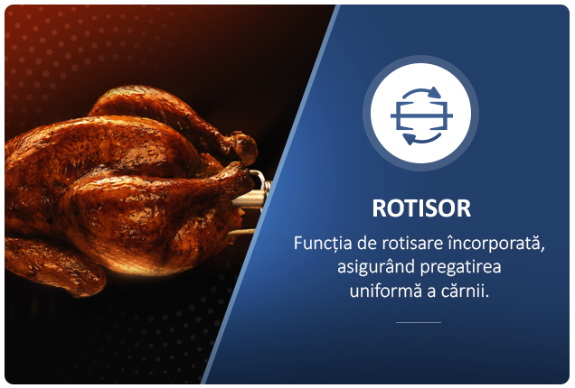 Accesoriul pentru rotisat, pozitionat in centrul cuptorului, asigura rotirea continua a preparatului pe toata durata gatirii, pentru rezultate perfecte si o rumenire uniforma.