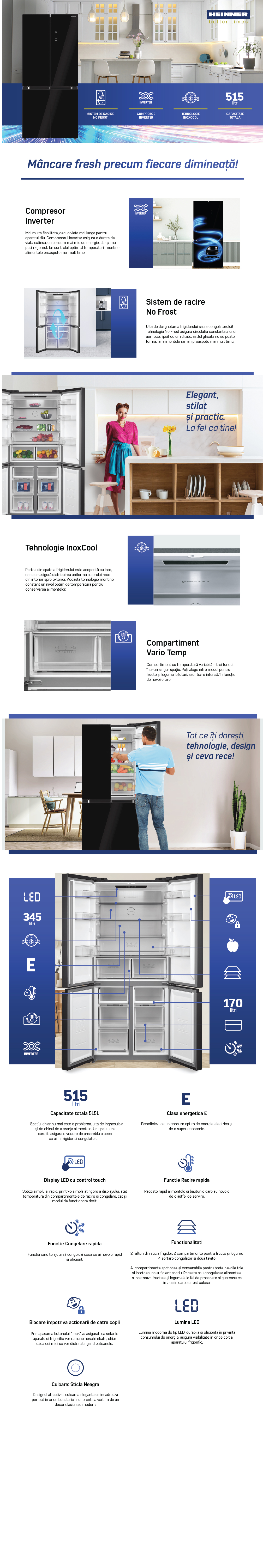 Frigider Side by Side Heinner HSBS-M515MDINVHGBKE++, 515L, No Frost, Compresor Inverter, Display Touch, 4 usi, Negru Sticla