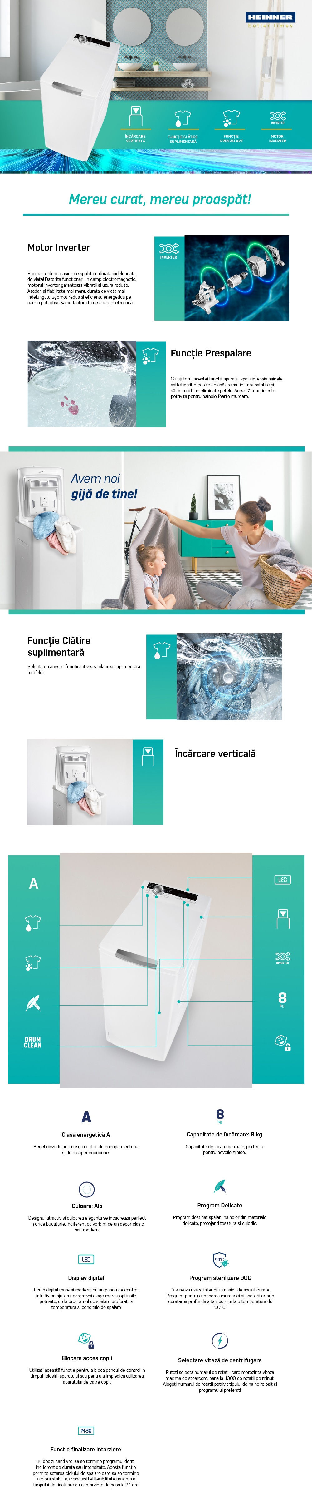 Masina de spalat rufe cu incarcare verticala Heinner HWM-TL8013IVA++, 8kg, 1300rpm, clasa A, motor inverter, 15 programe, display digital, program rapid 15min, program scurt 45min, Alba