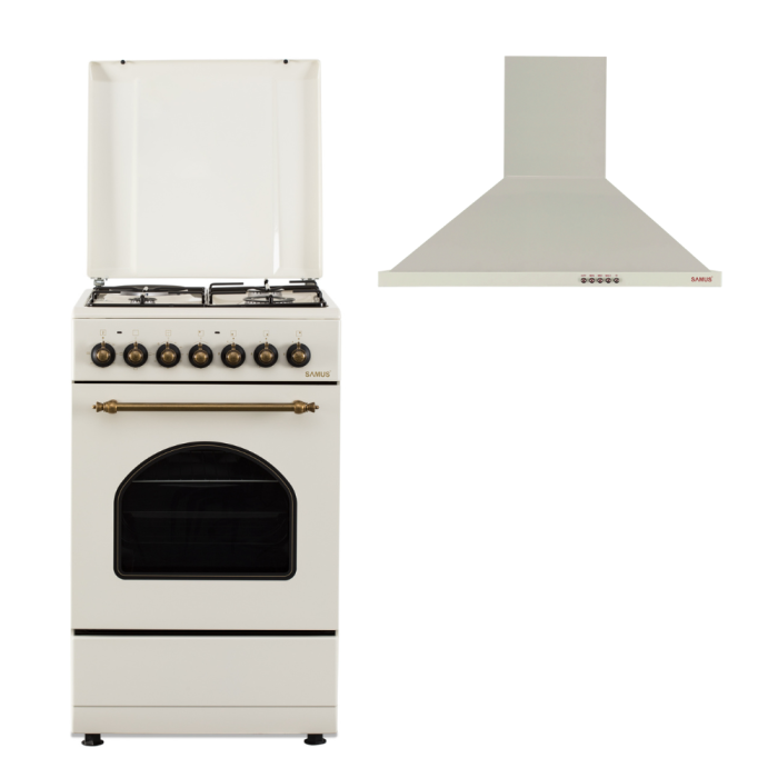 Pachet - Aragaz electric / gaz Samus SR550EL3C, 3 arzatoare gaz + 1 arzator electric, cuptor electric, aprindere electrica, dispozitiv siguranta arzatoare gaz + Hota decorativa Samus HS604DHR, Putere