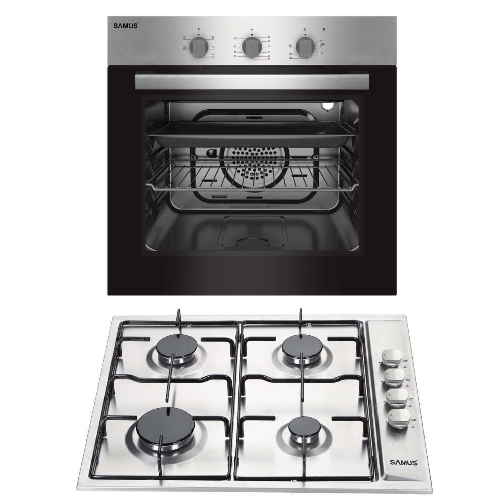 Pachet Cuptor Electric Încorporabil 56L + Plită pe Gaz 4 Arzătoare, Clasa A, Aprindere Electrică, Inox/Argintiu