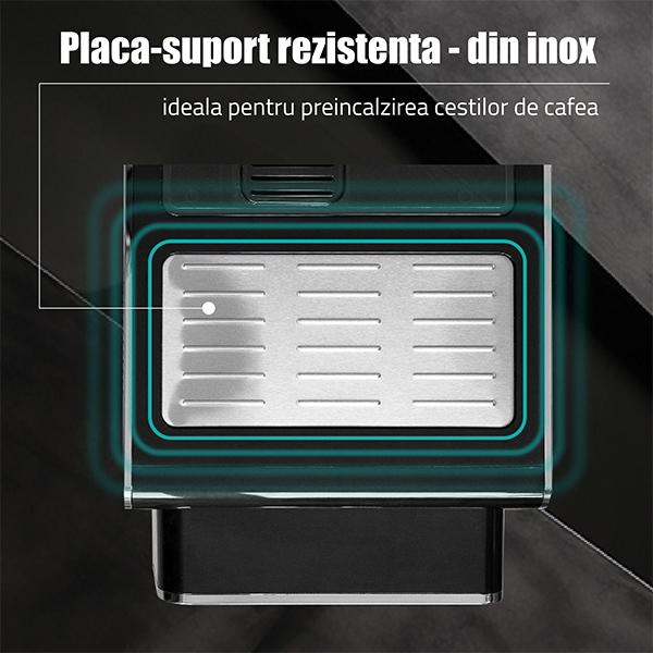 Espressorul Samus Perfection este prevazut cu o placa-suport rezistenta din inox, conceputa pentru durabilitate si stabilitate maxima. Materialul de calitate superioara asigura o suprafata robusta, usor de curatat si rezistenta la uzura zilnica. Aceasta constructie solida sustine perfect ceasca in timpul prepararii cafelei si contribuie la o experienta premium, pastrand aspectul elegant al aparatului in timp.