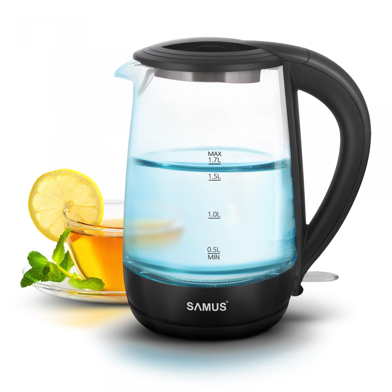 Fierbator electric din sticlă Samus AQUABELLE, 1.7 L, 2200 W, fără fir, bază rotativă 360°, oprire automată, protecție la supraîncălzire, iluminare LED