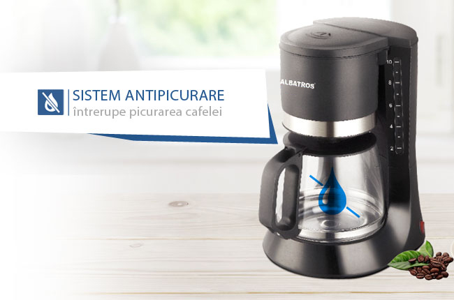 Acesta are in dotare sistemul antipicurare, ce intrerupe prepararea cafelei sau a ceaiului in momentul in care ridici cana din sticla pentru a-ti turna o ceasca de cafea sau ceai.