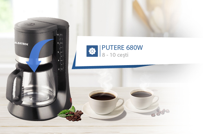 Avand o putere de 680 W, cafetiera Albatros Delice iti garanteaza prepararea a 10 cesti din bautura ta preferata in cel mai scurt timp.
