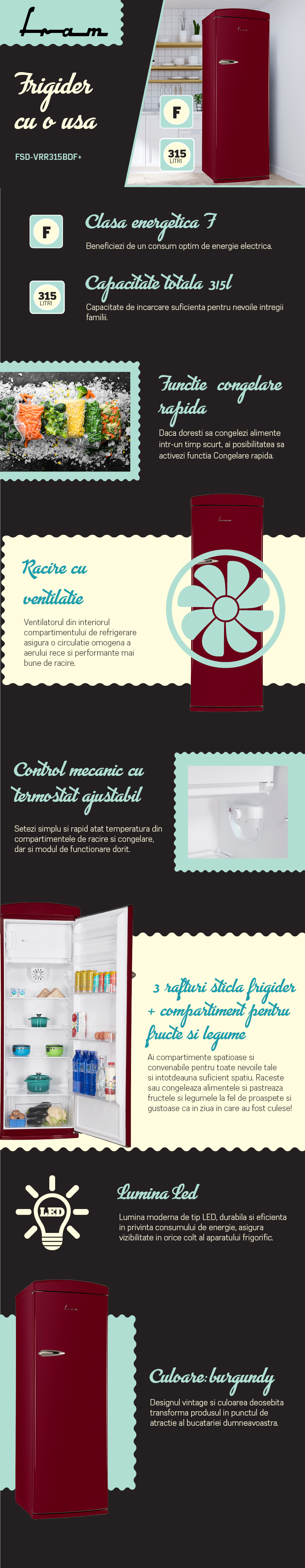 Fram Frigider cu o usa Fram FSD-VRR315BDF+, 315l, Ventilator, Lumina LED, H 176.9 cm, Visiniu