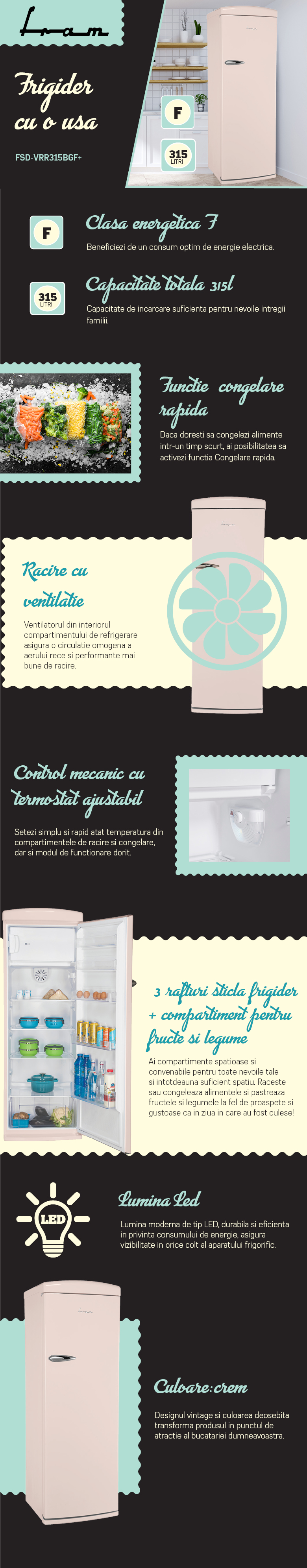Fram Frigider cu o usa Fram FSD-VRR315BGF+, 316 l, Ventilator, Lumina LED, Clasa F, H 176.9 cm, Crem