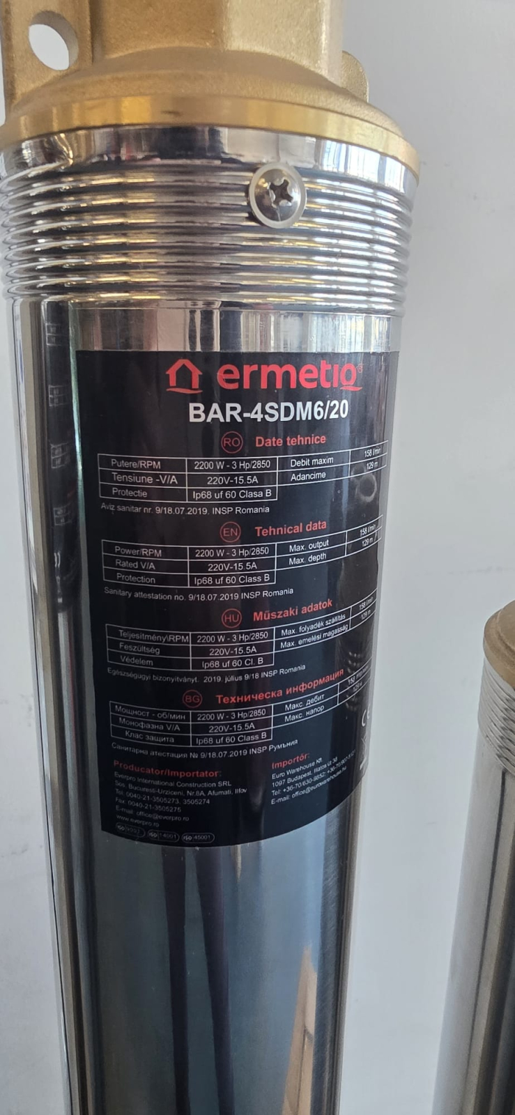 Pompa submersibilă Ermetiq 4SDM6/20, 2200W, 20 turbine, debit 9.5 mc/h, înălțime 129 m, inox, cablu 30 m