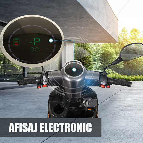 Cu afisajul electronic integrat, triciclul Samus iti ofera informatii esentiale in timp real: viteza, nivelul bateriei, semnalizari si alte functii de baza. Ecranul este clar, intuitiv si usor de citit atat ziua, cat si noaptea, ceea ce iti permite sa monitorizezi rapid starea vehiculului in timpul deplasarii.