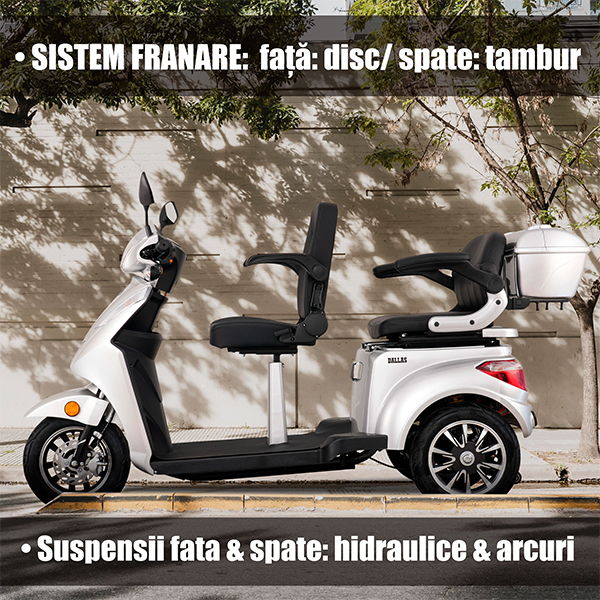Samus Dallas are sistem mixt de franare (disc fata, tambur spate) pentru opriri sigure. Suspensiile hidraulice cu arcuri absorb socurile pe orice drum. Ofera confort sporit in oras sau pe teren denivelat. Stabilitate si echilibru la fiecare deplasare.