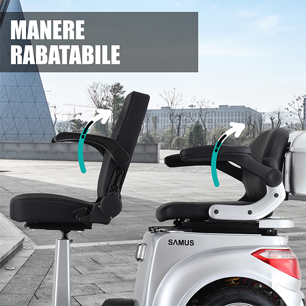 Triciclul Samus este echipat cu un maner rabatabil care faciliteaza accesul rapid si sigur in vehicul, oferind o experienta confortabila chiar si persoanelor in varsta sau cu mobilitate redusa. Designul pliabil si ergonomic economiseste spatiu si imbunatateste confortul la urcare si coborare.