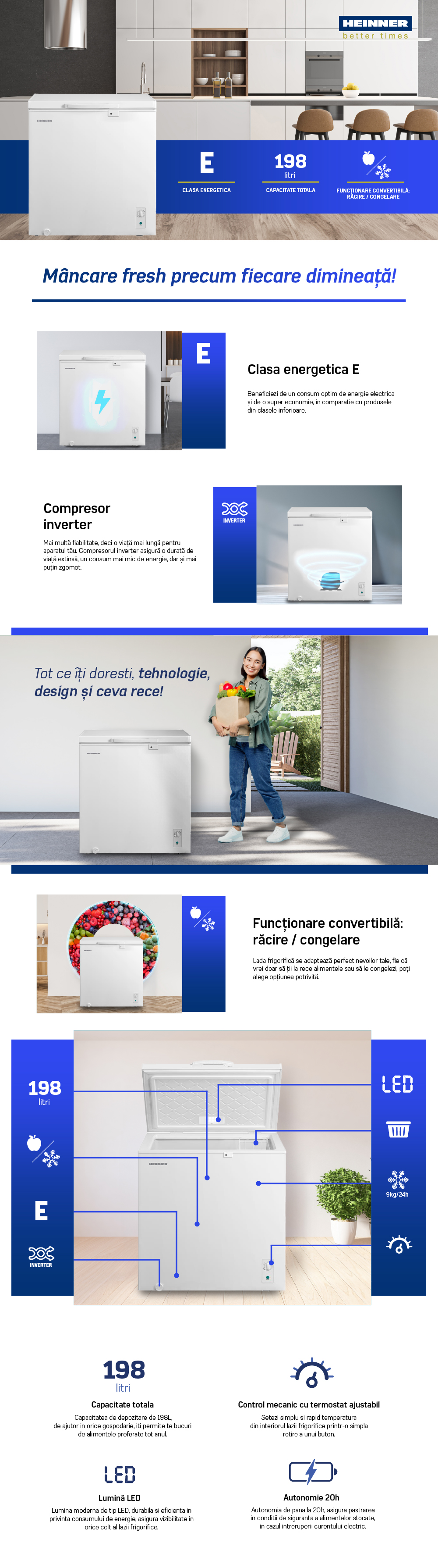 Lada frigorifica HEINNER HCF-M198INVCE++, 198L, Clasa E, Convertibila(Frigider/Congelator), Compresor inverter, Control mecanic, Termostat ajustabil, Luminare LED