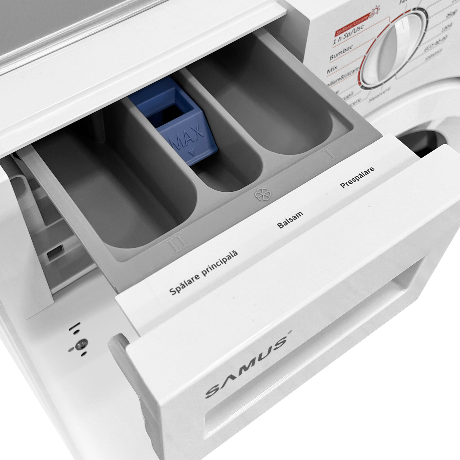 Avand o capacitate de 8 kg rufe la spalare si 6 kg la uscare, masina de spalat cu uscator Samus se transforma intr-o solutie excelenta pentru tine si familia ta, avand posibilitatea sa speli mai mult intr-un timp mai scurt.