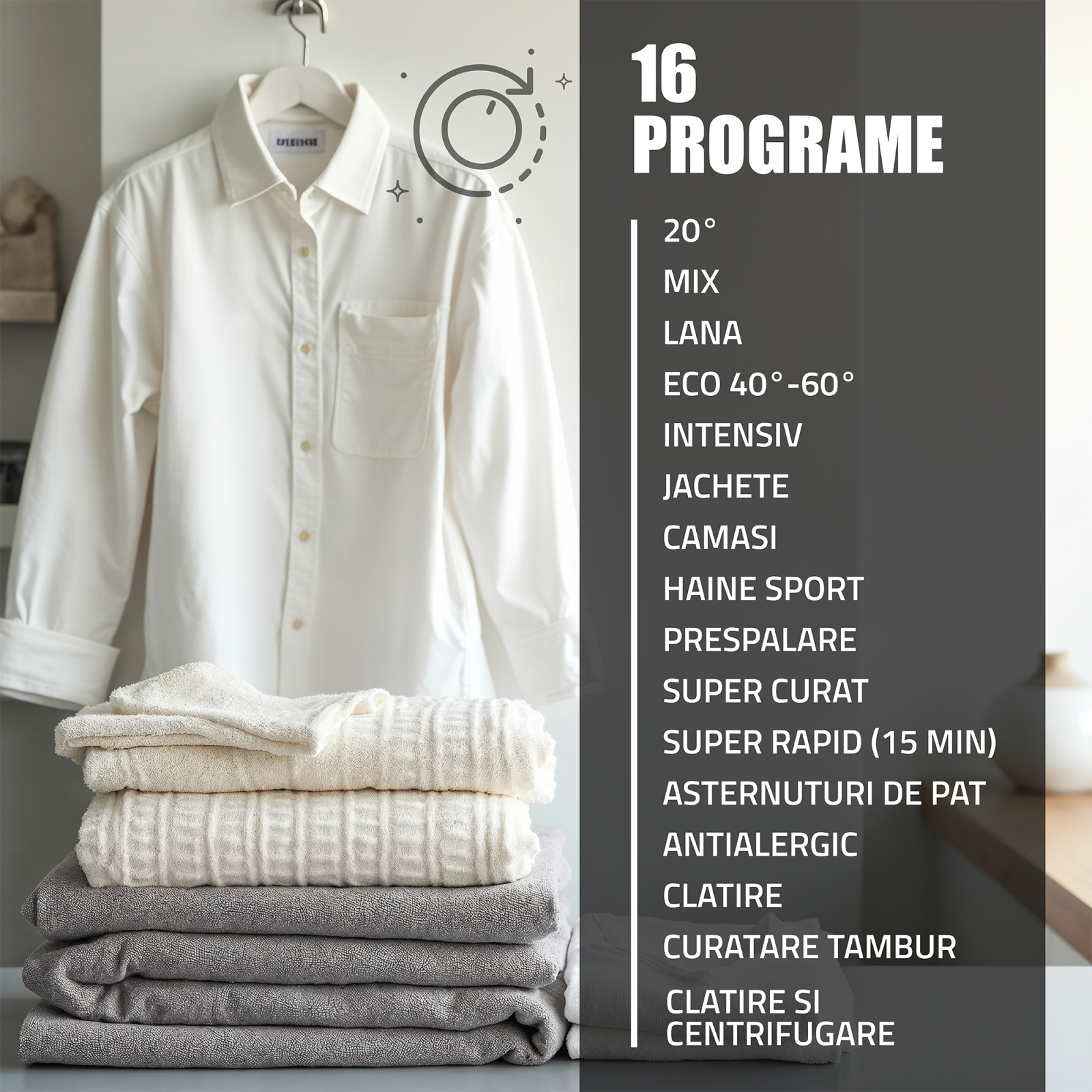 Masina ofera 16 programe flexibile: Super Rapid (15 min), Bumbac, Lana, Camasi, Haine Sport, Mix, 20℃, ECO 40-60, Asternuturi de pat, Intensiv, Antialergic, Prespalare, Delicate, Curatare Tambur, Centrifugare, Clatire si centrifugare. Indiferent de gradul de murdarie sau tipul de material, poti alege programul optim pentru a asigura o spalare perfecta. Datorita vitezei de centrifugare de 1200 rpm, rufele sunt stoarse eficient, reducand timpul de uscare si pastrand hainele in stare impecabila.