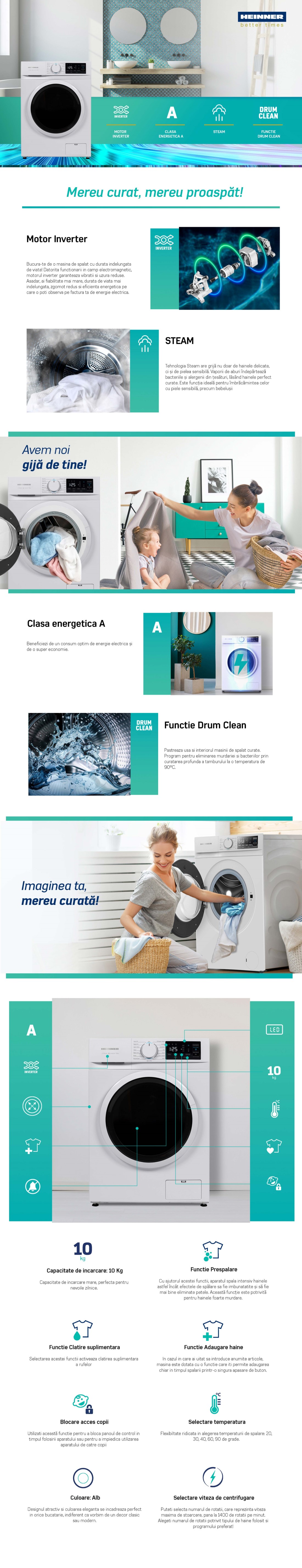Masina de spalat rufe Heinner HWM-M1014IVNA+++, 10kg, 1400rpm, clasa A, motor inverter, 15 programe, display digital, functie adaugare rufe