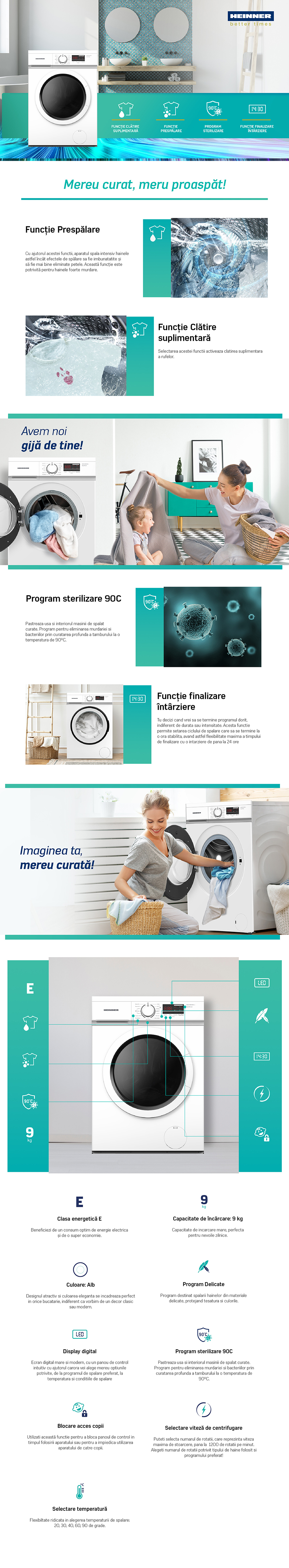 Masina de spalat rufe Heinner HWM-M9012DCE++, 9 kg, 1200 rpm, Clasa E, Display digital, Blocare acces copii, Alb