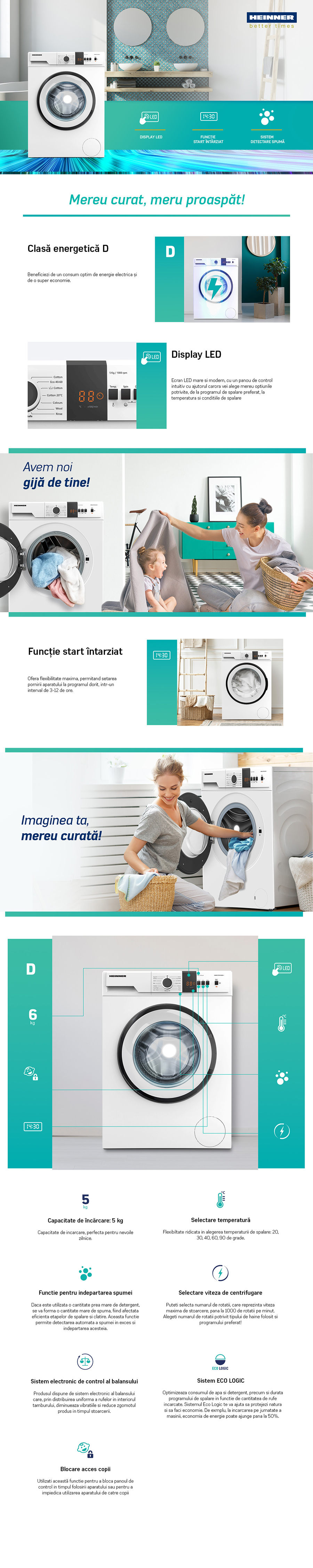 Masina de spalat rufe Heinner HWM-VT0510CHD++, 5 kg, 1000 rpm, Display digital, Blocare acces copii, Alb
