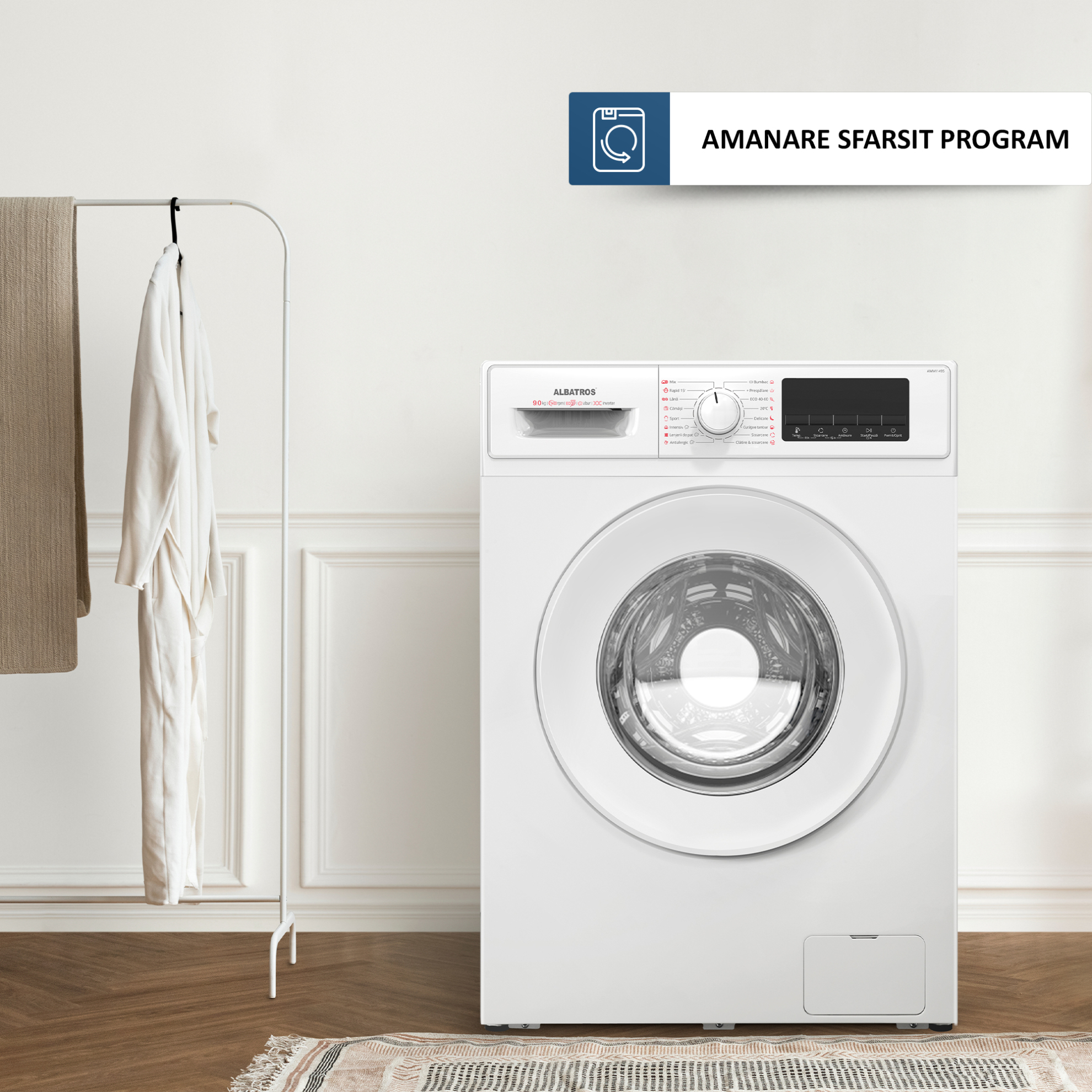 Masina de spalat rufe Albatros AWMI1495, 9 kg, 1400 rpm, Motor Inverter, Clasa A -10%, Spălare cu abur, Alb
