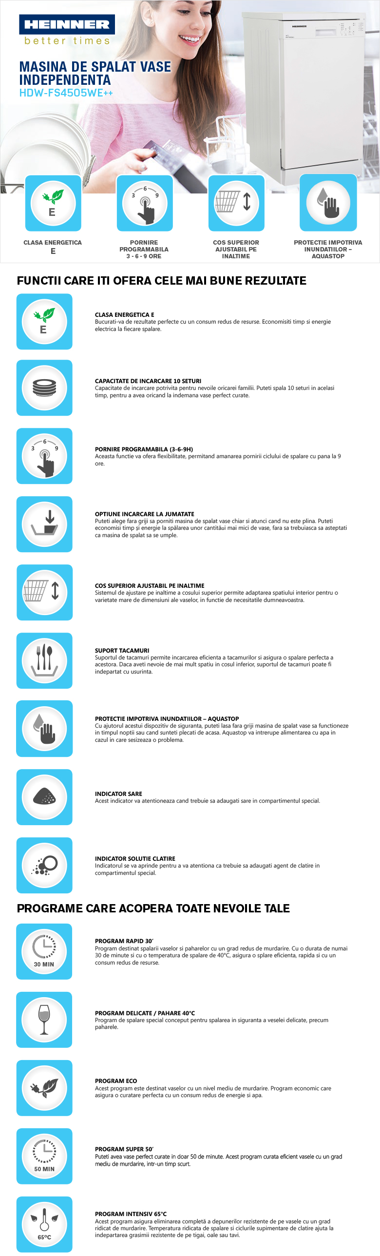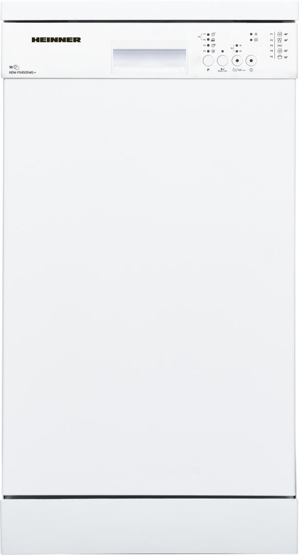 Masina de spalat vase Heinner HDW-FS4505WE++, 10 Seturi, 5 programe, Clasa E, Half load, Aquastop, 45 cm, Alb