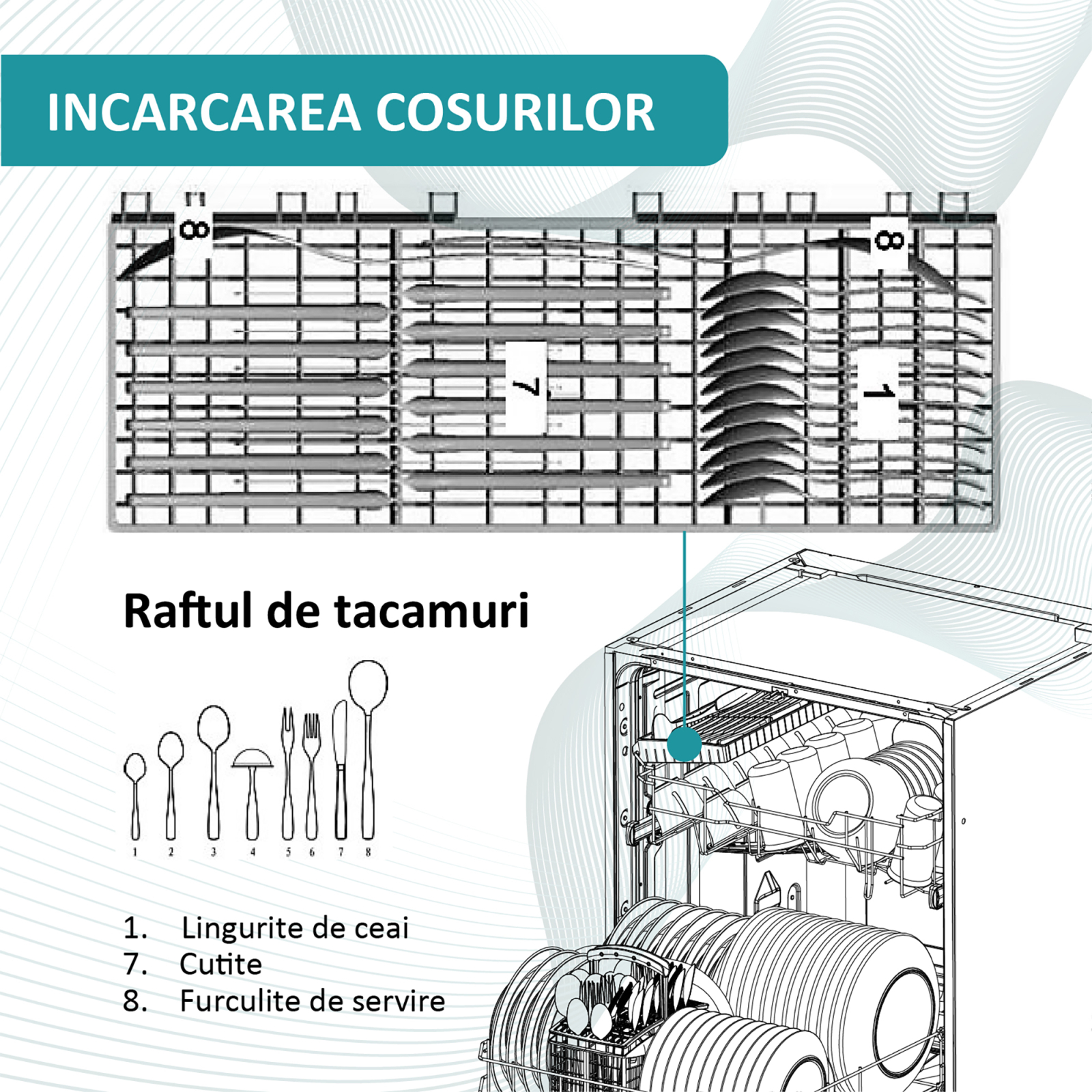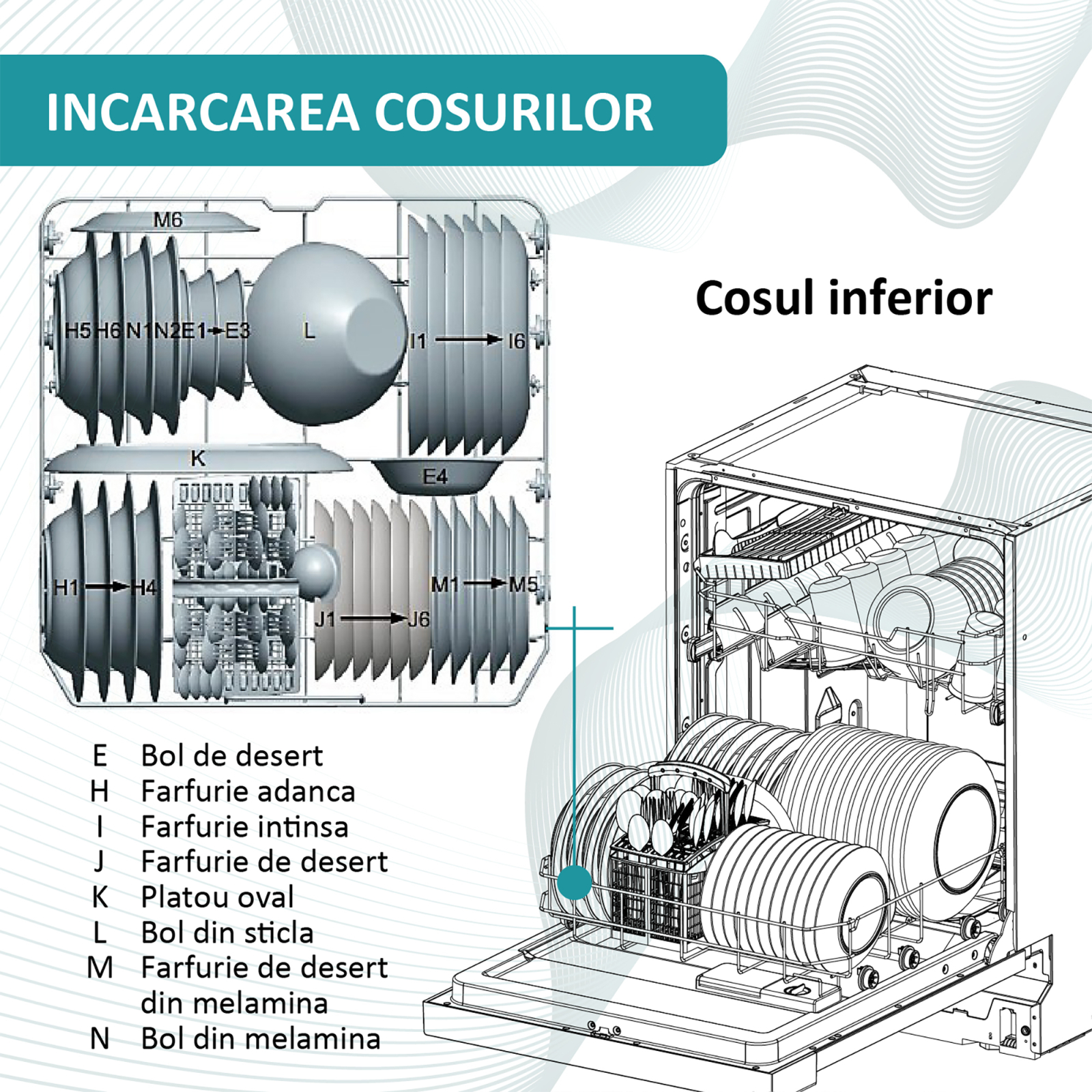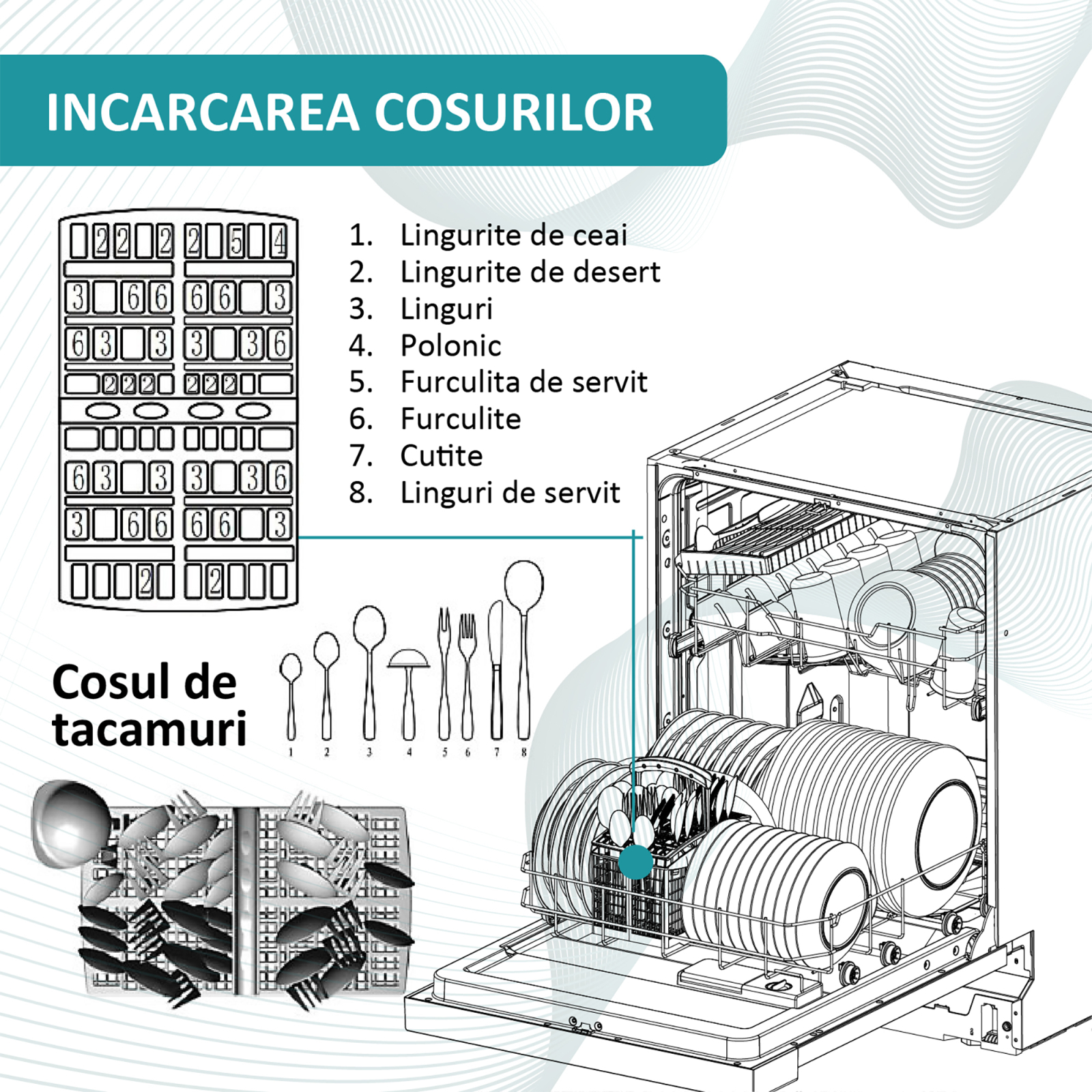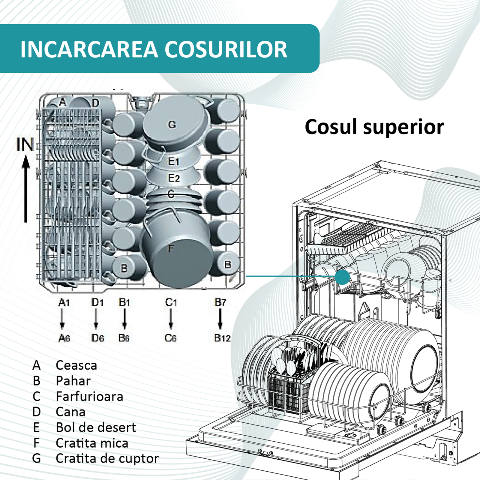 Farfurii, oale, cani, pahare. Toate se vor spala in siguranta datorita celor doua cosuri din dotare, cu compartimente speciale pentru fiecare vas in parte