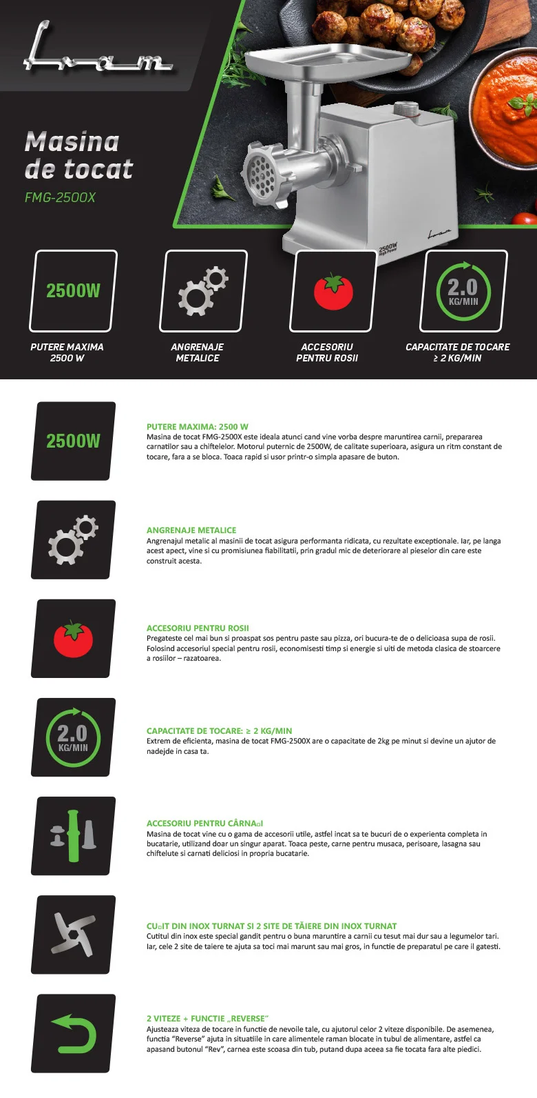 Masina de tocat FRAM FMG-2500X, 2500 W, capacitate de tocare: ≥ 2 kg/min, accesorii pentru rosii si carnati, 2 site de taiere, 2 viteze + functie Reverse, Aluminiu