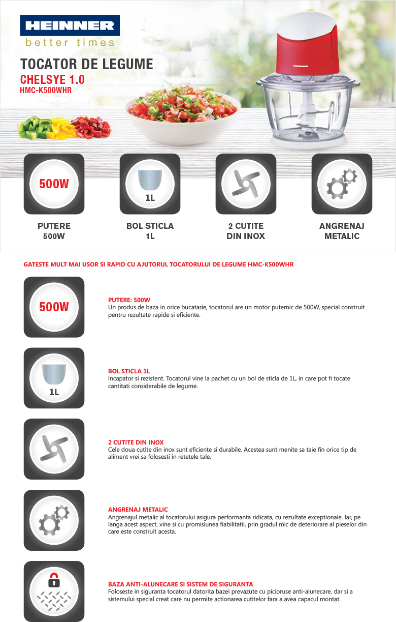 Tocator de legume Heinner HMC-K500WHR, 500W, 1 l, 2 cutite din inox, angrenaj metalic, baza anti-alunecare, bol sticla, sistem de siguranta, alb/rosu