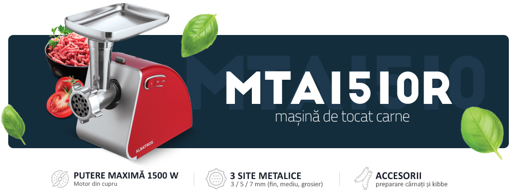 Masina de tocat Albatros MTA1510R, 1500 W (motor 500 W), 1.8 kg/min, 3 site inox (3/5/7 mm), accesorii cârnați, kibbe și separator de roșii, culoare roșie