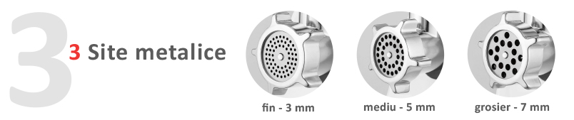 Mic, mediu, mare? Cum doresti sa toci carnea sau legumele? Indiferent de raspuns, gasesti imediat solutia cu ajutorul celor trei site din otel incluse in pachet. Alaturi de cutitul din otel inoxidabil, acestea toca rapid carnea sau restul alimentelor, urmand ca tu sa gatesti tot ceea ce iti doresti.