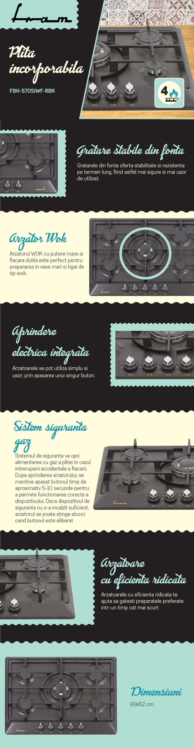 Fram Plita incorporabila Fram FBH-S705IWF-RBK, Gaz, 5 arzatoare, Wok, Aprindere electrica, Gratar fonta, Duze GPL incluse, 70 cm, Negru