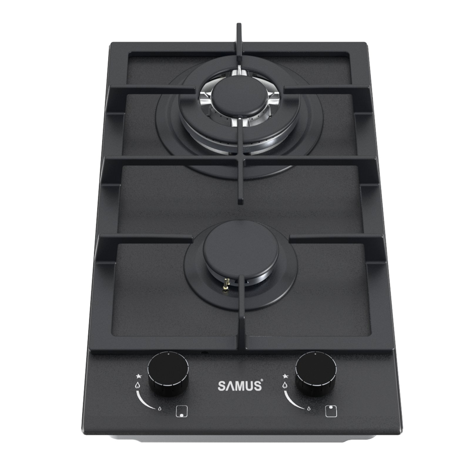 Plita incorporabila Samus PSG-32SMGN1, pe gaz, 2 arzătoare (1 mare 2.4 kW, 1 mediu 1.8 kW), sticlă neagră mată Nano, grătar fontă, aprindere electrică, panou frontal, siguranță la arzătoare, 29.4 cm