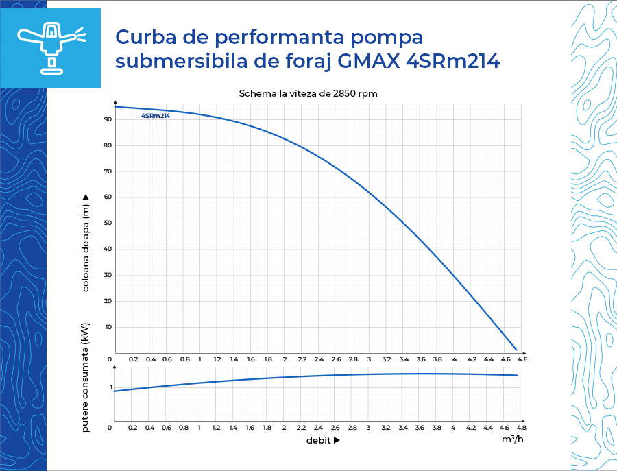 Pompa submersibila de foraj Gmax 4SRm214-0.75, putere 750 w, 14 turbine, debit 4.5 m3/h, coloana de apa 95 m, cupru