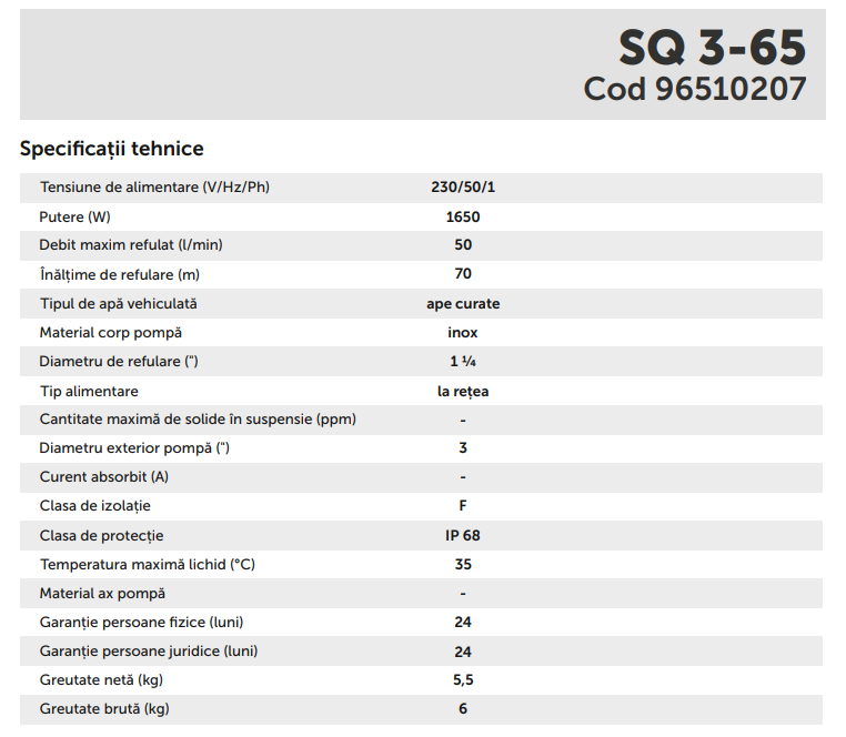 Pompa submersibila multietajata pentru ape curate Grundfos SQ 3-65, 96510207, 3", 1.65 kW, 230 V, inaltime max. refulare 70 m, debit 3 mc/h.