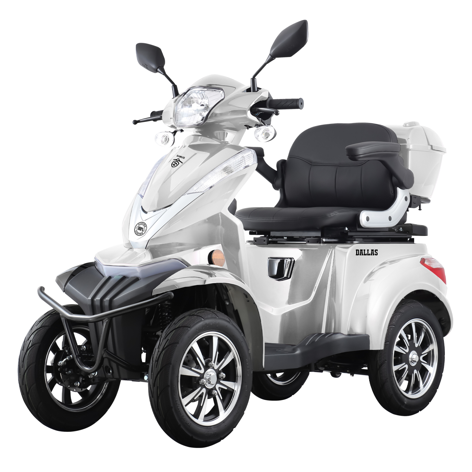 Cvadriciclul electric Samus este echipat cu un motor fara perii de 1000W, care ofera o eficienta energetica ridicata si un consum optim. Datorita tehnologiei fara perii, motorul are o durata de viata mai lunga, necesita intretinere minima si functioneaza silentios, oferind o experienta de condus placuta si lina. Este alegerea ideala pentru utilizatorii care isi doresc mobilitate moderna, fara batai de cap.