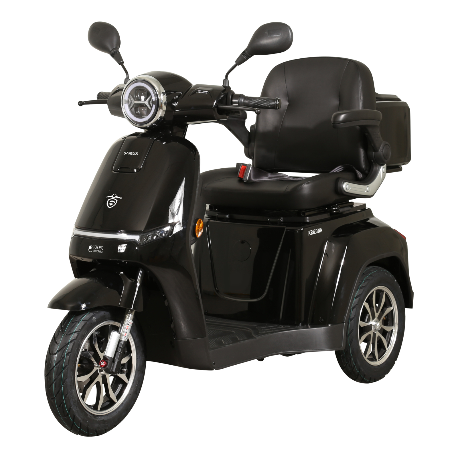 Samus Arizona Black are sistem mixt de franare (disc fata, tambur spate) pentru opriri sigure. Suspensiile hidraulice cu arcuri absorb socurile pe orice drum. Ofera confort sporit in oras sau pe teren denivelat. Stabilitate si echilibru la fiecare deplasare.