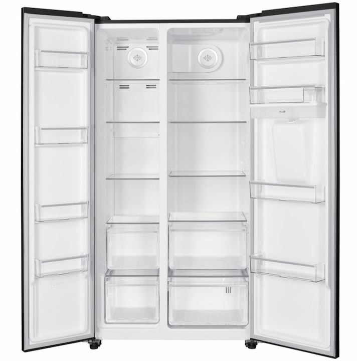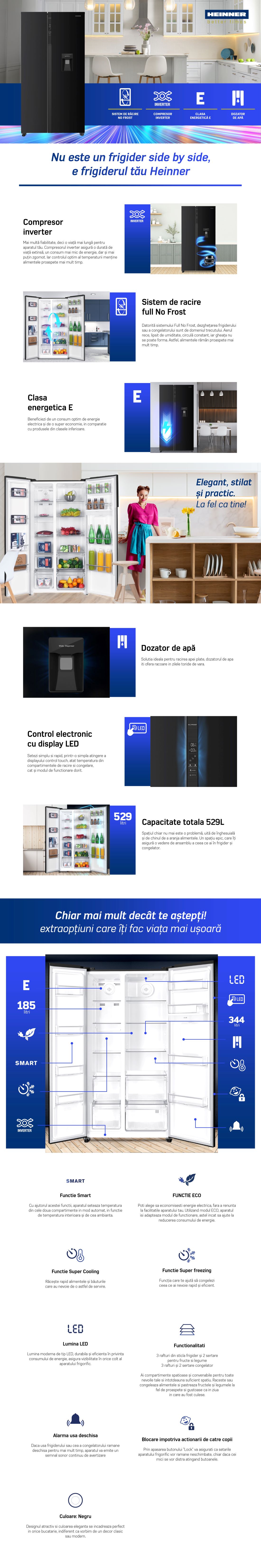 Side by side Heinner HSBS-HM529NFBKWDE++, 529 l, Full No Frost, Clasa E, Dispenser apa, Display LED tactil, Eco, Alarma usa deschisa, H 177 cm, Negru