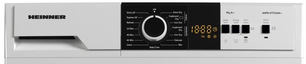 Resigilat - Uscator de rufe Heinner HHPD-V7T1CHA++, Pompa de caldura, 7 kg, 15 programe, Clasa A++, Display LED, Lumina cuva, Blocare acces copii, Alb