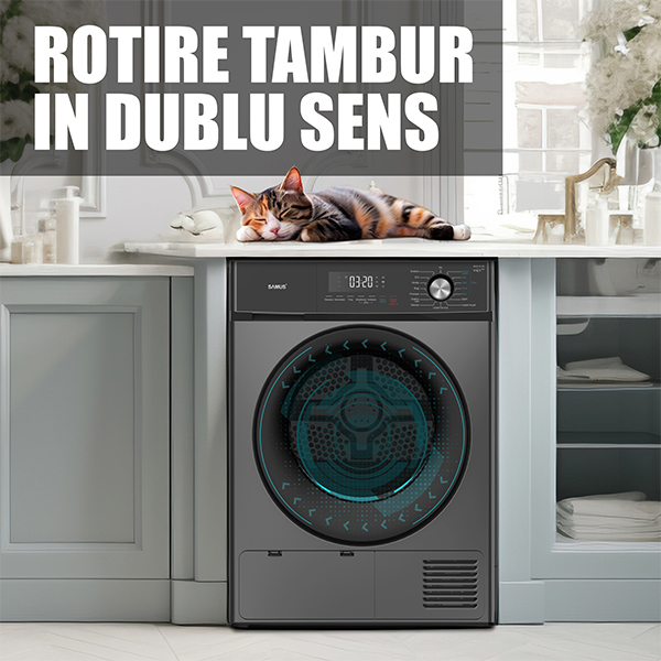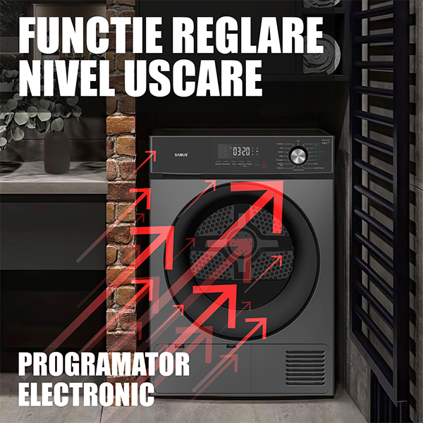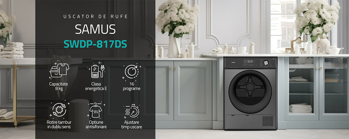 Fa-ti viata mai usoara! Cu uscatorul de rufe Samus, spalatul rufelor nu mai este o corvoada. Te bucuri de confort, economie de timp si o eficienta de top. Hainele tale vor fi gata de purtat rapid si fara efort, iar tu ai mai mult timp pentru ceea ce conteaza cu adevarat. Alege acum solutia moderna pentru o casa ordonata si rufe perfect uscate!
