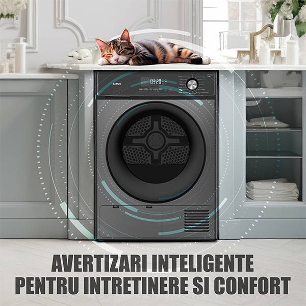 Uscatorul este echipat cu un sistem de avertizare care te tine mereu informat atunci cand rezervorul de apa trebuie golit, cand filtrele au nevoie de curatare pentru a mentine performanta optima si cand programul de uscare s-a incheiat. Aceste semnale simple si utile contribuie la o functionare sigura, eficienta si fara griji, prelungind durata de viata a aparatului si protejand hainele tale.