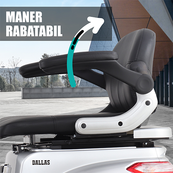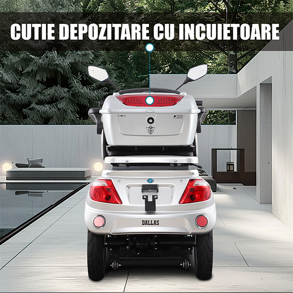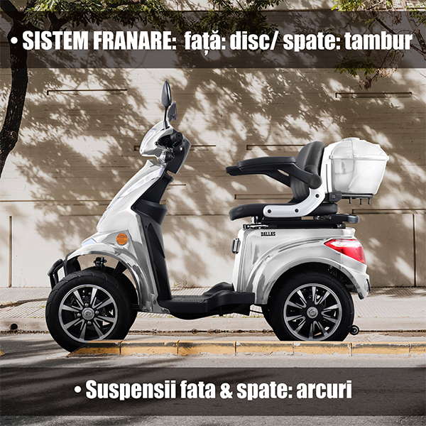 Dallas Silver are sistem mixt de franare (disc fata, tambur spate) pentru opriri sigure. Suspensiile hidraulice cu arcuri absorb socurile pe orice drum. Ofera confort sporit in oras sau pe teren denivelat. Stabilitate si echilibru la fiecare deplasare.