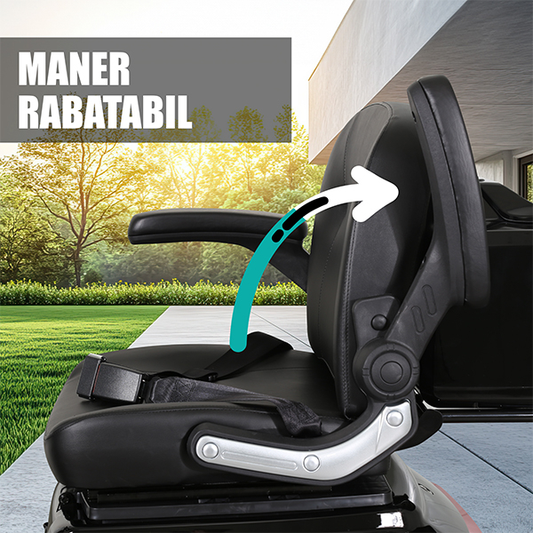 Triciclul Samus este echipat cu un maner rabatabil care faciliteaza accesul rapid si sigur in vehicul, oferind o experienta confortabila chiar si persoanelor in varsta sau cu mobilitate redusa.