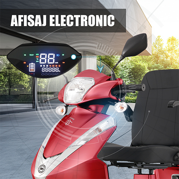 Cu afisajul electronic integrat, triciclul Samus iti ofera informatii esentiale in timp real: viteza, nivelul bateriei, semnalizari si alte functii de baza. Ecranul este clar, intuitiv si usor de citit atat ziua, cat si noaptea, ceea ce iti permite sa monitorizezi rapid starea vehiculului in timpul deplasarii.